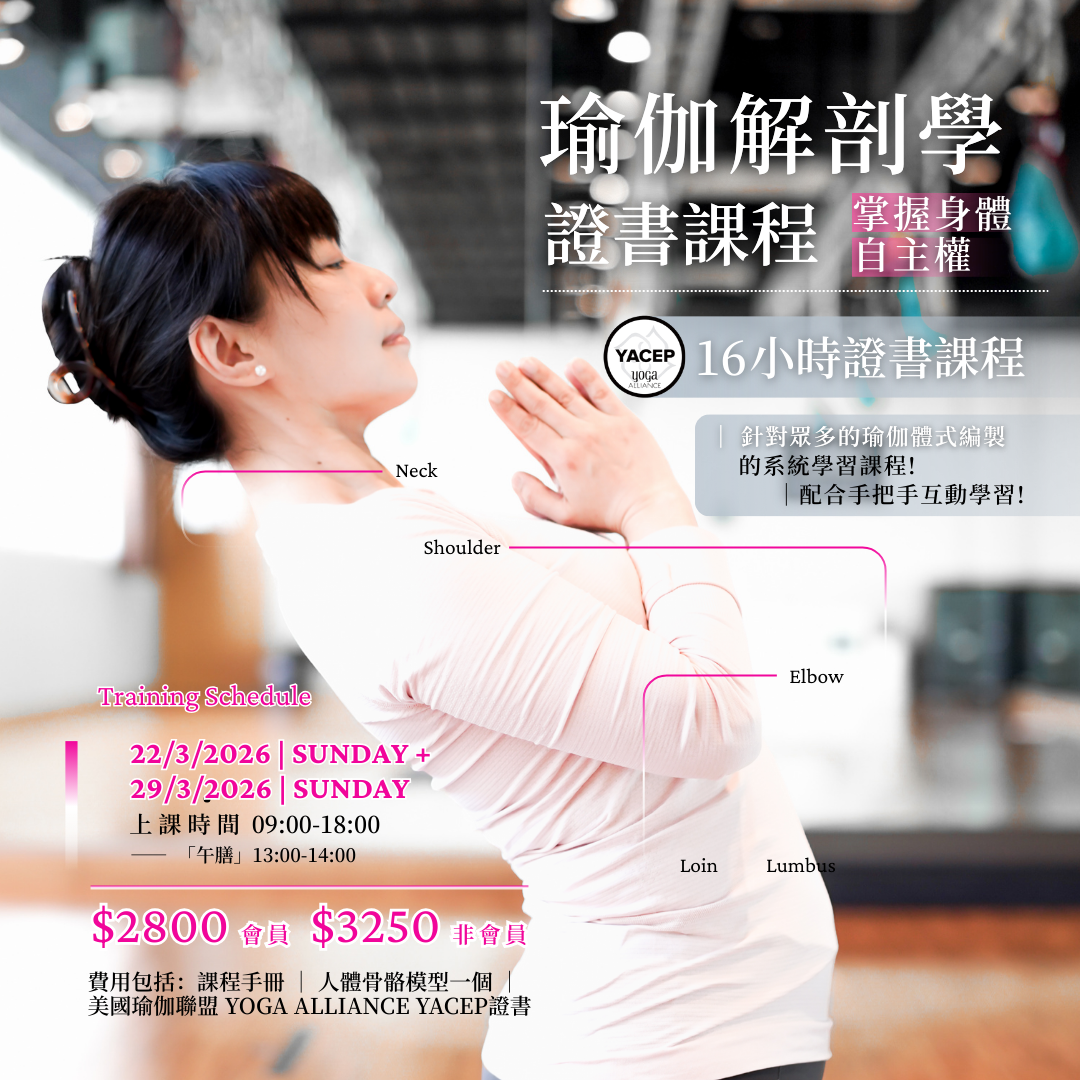 Cora previously wrote the yoga column “Master’s Guidance” for the Sing Tao Daily supplement (2018‑2019), where she actively promoted scientific, safe, and functional yoga practice. This course will combine her extensive teaching experience and anatomical expertise to guide students in deeply understanding body structure and mastering essential knowledge for autonomous practice and teaching.
